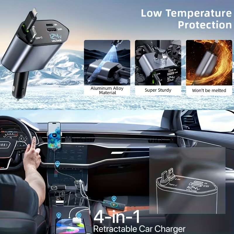 A high-speed 120W universal car charger with a retractable USB cable, male-to-female connector, and broad device compatibility. No battery required for seamless charging on the go.